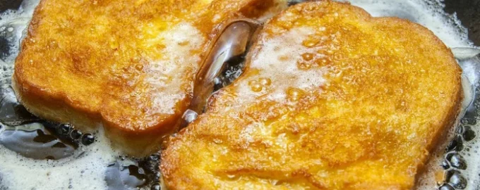 - Ζεσταίνετε το φυτικό λάδι σε ένα τηγάνι σε μέτρια φωτιά, βουτάτε κάθε φέτα φραντζόλας και από τις δύο πλευρές στο μείγμα αυγού και γάλακτος, την τοποθετείτε στο τηγάνι και τηγανίζετε και από τις δύο πλευρές μέχρι να πάρει χρώμα.