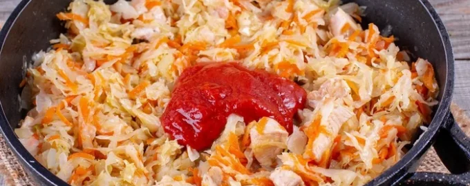 - Προσθέστε το λάχανο, ανακατέψτε και σιγοβράστε κάτω από κλειστό καπάκι σε μέτρια φωτιά για 10-12 λεπτά, ανακατεύοντας κατά διαστήματα, στη συνέχεια προσθέστε τον πελτέ ντομάτας, το τριμμένο μαύρο πιπέρι, το φύλλο δάφνης, τη ζάχαρη, το αλάτι, ρίξτε νερό και ανακατέψτε καλά.