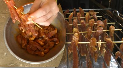 Αντί να τοποθετήσετε το κρέας σε ένα ταψί, ο συγγραφέας αυτής της συνταγής προτείνει τη χρήση ξύλινων σουβλακιών. Τα κομμάτια είναι δεμένα σε σειρά έτσι ώστε να υπάρχει χώρος μεταξύ τους και τα ίδια τα σουβλάκια στερεώνονται στη σχάρα του φούρνου.