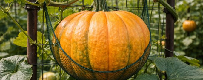 Για την επιτυχή ωρίμανση των μεγάλων κολοκυθιών σε στήριγμα, αρκεί να παρακολουθείτε την τάση του διχτυού στήριξης και να αφαιρείτε εγκαίρως τους πλεονάζοντες βλαστούς.