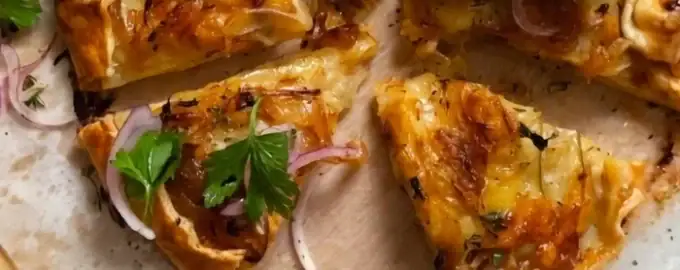 Αυτή η τάρτα είναι μια πραγματική γαστρονομική απόλαυση, οι λεπτές φέτες πατάτας λιώνουν στο στόμα σας, οι γλυκές στρώσεις καραμελωμένου κρεμμυδιού προσθέτουν βάθος γεύσης και το μείγμα τσένταρ, παρμεζάνας και μοτσαρέλας κάνει το πιάτο απίστευτα κρεμώδες.