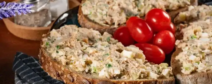 Μια απλή, νόστιμη εκδοχή ενός ορεκτικού από φραντζόλα, κονσερβοποιημένο ψάρι και λαχανικά.