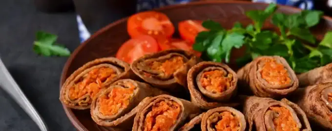 - Αλείψτε την επιφάνεια της κάθε τηγανίτας με ένα λεπτό στρώμα αβγολέμονο, τοποθετήστε τη γέμιση λαχανικών στην άκρη της τηγανίτας και τυλίξτε την σε ρολό.