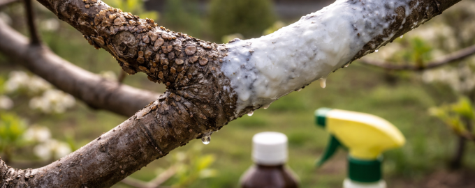 Τα παλιά δέντρα πρέπει να καθαρίζονται από τις λειχήνες με μεταλλική βούρτσα πριν από τον ψεκασμό.