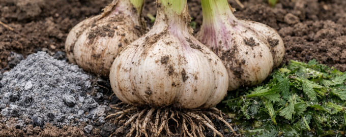 Για να φτάσει το σκόρδο σε μέγεθος γροθιάς, χρειάζεται ζωτικά διαθέσιμο άζωτο και θείο στην αρχή της καλλιεργητικής περιόδου. Αντί για χημικά σφαιρίδια, είναι προτιμότερο να χρησιμοποιείτε τέφρα ξύλου και ένα έγχυμα από κοινή τσουκνίδατα οποία αποξειδώνουν απαλά το έδαφος και παρέχουν ένα πλήρες φάσμα μικροθρεπτικών συστατικών.