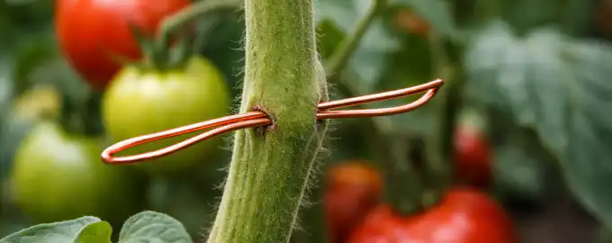 Όταν ο μίσχος της ντομάτας έχει μεγαλώσει δυνατά και έχει φτάσει στο πάχος ενός μολυβιού, μπορείτε να ξεκινήσετε τη διαδικασία. Με την αιχμηρή άκρη του σύρματος, τρυπήστε απαλά τη φλούδα. Το μήκος της τομής θα πρέπει να είναι περίπου 3-4 εκατοστά. Ο χαλκός θα αρχίσει να λειτουργεί μόλις έρθει σε επαφή με το χυμό του φυτού, ενισχύοντας το ανοσία του σπορόφυτου από μέσα προς τα έξω.