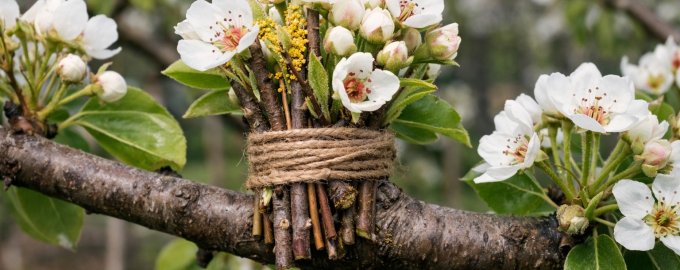 Αυτό είναι το αγαπημένο μου leafhack που λειτουργεί 100% του χρόνου. Αν δεν έχετε χώρο για ένα δεύτερο δέντρο, χρησιμοποιήστε έναν προσωρινό επικονιαστή. Η ιδέα είναι απλή: όταν η αχλαδιά σας αρχίσει να ανθίζει, κόψτε μερικά ανθισμένα κλαδιά μιας διαφορετικής ποικιλίας από το δέντρο ενός γείτονα ή από το δάσος (οι άγριες αχλαδιές είναι εξαιρετικός επικονιαστής). δωρητής γύρης).