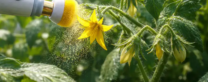Η λύση στο πρόβλημα της πτώσης των ανθέων της ντομάτας έγκειται στον συνδυασμό του μηχανικού κουνήματος των θάμνων για τη μεταφορά της γύρης και του διαφυλλικού ψεκασμού με.