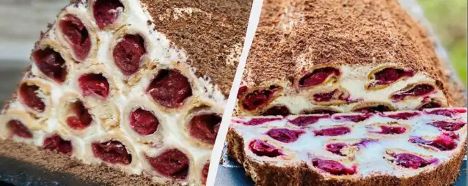 Ένα πολύ νόστιμο κέικ με κεράσια και σφολιάτα θα κερδίσει τους πάντες. Ετοιμάστε καυσόξυλα κάτω από το χιόνι – μια συνταγή που θα αρέσει σε όλους / screenshot.