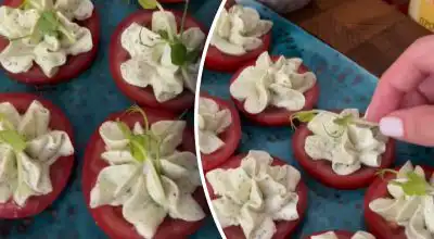 Μια συνταγή για ένα πολύ νόστιμο σνακ με ντομάτα. Αντιγραφή συνδέσμου Γρήγορο ορεκτικό που θα γίνει το αστέρι του τραπεζιού / Κολάζ: My, φωτογραφία: screenshots από το βίντεο.